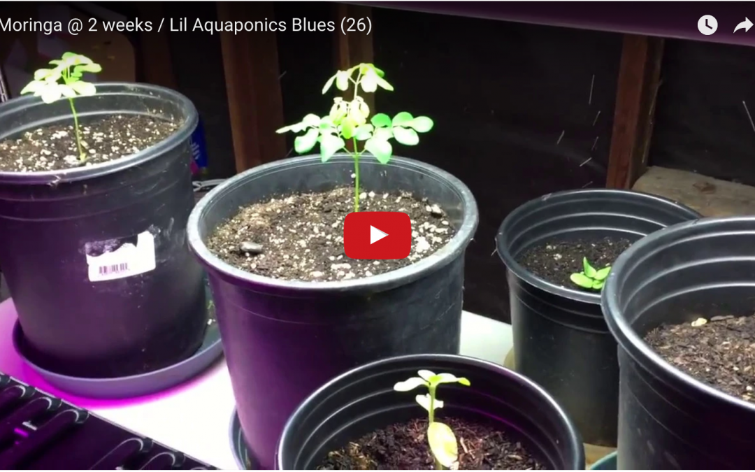 A quick view of the Moringa Oleifera starts at two weeks, roughly 6-8″ (fresh potting soil), and one in “less fresh” potting soil that is 4″. Also, an ammonia spike inspires discussion of the frustrations of running a small (50gal) aquaponics system.